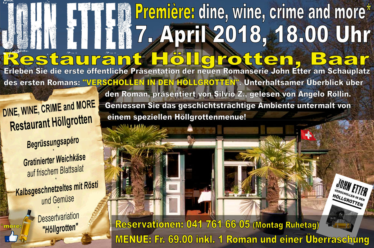 Erleben Sie die erste öffentliche Präsentation der neuen Romanserie "JOHN ETTER" am Schaupaltz des ersten Romans: "Verschollen in den Höllgrotten". Unterhaltsamer Überblick über den Roman, präsentiert von Silvio Z., gelesen von Angelo Röllin. Geniessen Sie das geschichtsträchtige Ambiente untermalt von einem speziellen Höllgrottenmenue!